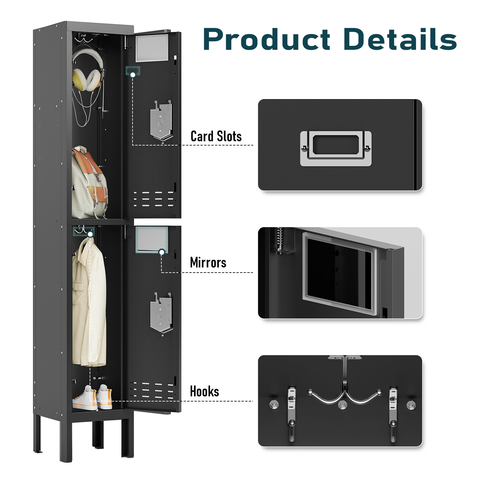 【Lockers Details】Each metal locker features an adjustable hat shelf, 2 single wall hooks and a double ceiling hook,Card slots and Air vents.Each locker also comes with 1 mirrors, a screwdriver, and a pair of gloves.