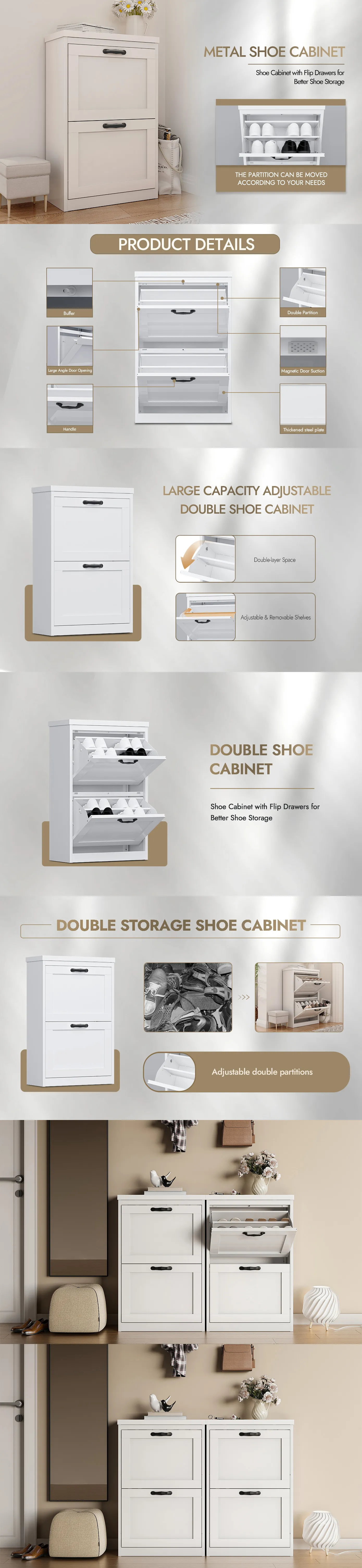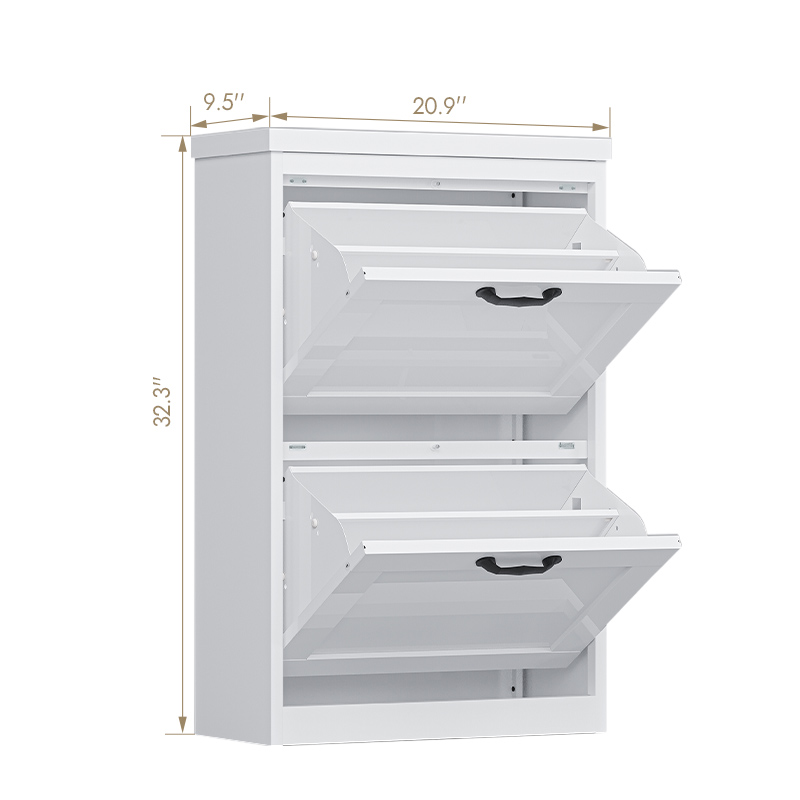 [ Large Storage Space ]: This shoe storage cabinet has two flip drawers, each with two levels. The center divider of each drawer can be adjusted or removed to accommodate different shoe sizes. Product dimensions: 32.3” (H) x 20.9” (W) x 9.5” (D) .